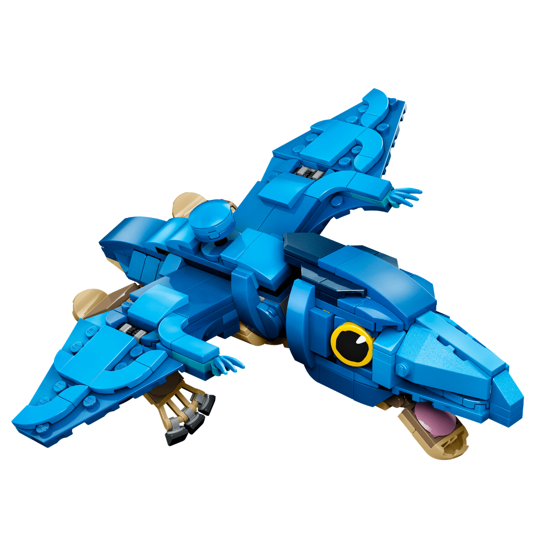 亮蓝+浅棕配色的小翼龙,背部有机关可拍动翅膀,头部、腿部、嘴巴均可动。附带一只红色鱿鱼小模型,适合摆拍或作为桌面小摆件。