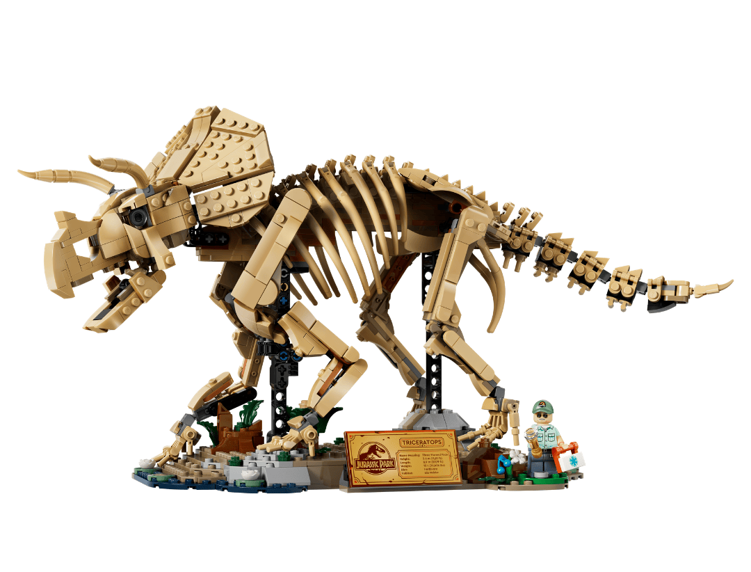 这是继 76968 恐龙化石:霸王龙之后的第二款大型恐龙骨架模型。三角龙骨骼精细,头部、腿部、尾巴可动,下颚可开合。附带湿地/白垩纪展示底座、信息铭牌和隐藏彩蛋,以及 Dr. Gerry Harding 人仔。非常适合与霸王龙化石并排展示。