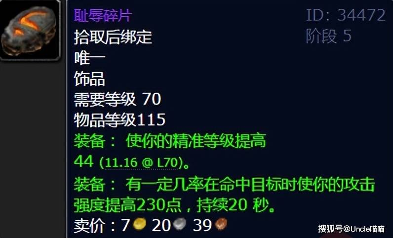 要说TBC版本精准装备里恐怖如斯的“卷王之王”,耻辱碎片绝对当之无愧。作为魔导师平台三号BOSS女祭司德莉希亚掉落的饰品,它的入手难度堪称亲民——英雄模式五人本每日一刷,掉率还不低,潜行队更是能轻松批量产出。但属性却堪称“超模”,常驻44点精准等级,直接让近战职业的输出稳定性飙升。更别说它还附带一个被动特效,触发后20秒内提升230点攻击强度,内置CD仅45秒,覆盖率高的很炸裂,特别是惩戒骑拿了锁格子无压力。