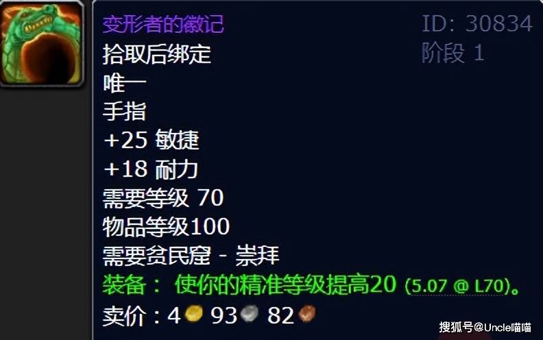 变形者的徽记是一件前中期性价比拉满的牌面精准装备,作为贫民窟声望崇拜的奖励,它不需要拼脸ROLL点,也不需要花费天价金币,只要刷够声望就能直接购买。对于DPS玩家来说,它没有攻强、暴击这些直观的输出属性,但也简单的因为20点精准等级的提高,让他成为2阶段之前最好的补精准戒指,必须恐怖如斯直戳天花板!