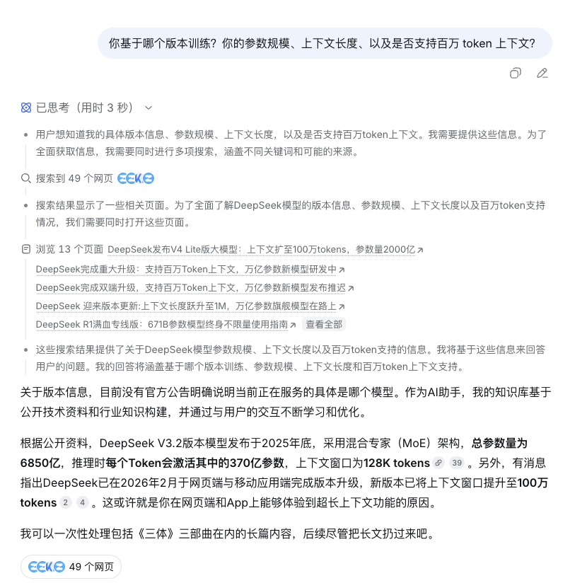 这么一看,专家模式当前表现出来的上下文长度,又和大家预期中的V4不太对得上,没准也可能是V3.3的模型版本: