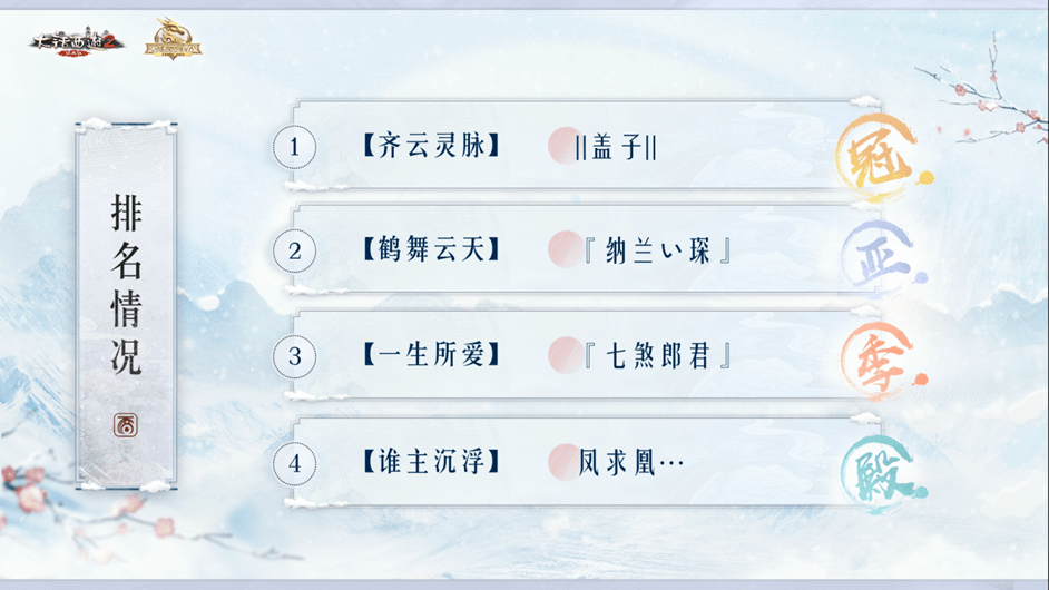恭喜齐云灵脉服务器“‖盖子‖”率领的战队夺得冠军,鹤舞云天服务器“『纳兰ぃ琛』”带领的队伍获得亚军,一生所爱服务器“『七煞郎君』”带领的队伍斩获季军,而谁主沉浮服务器“凤求凰…”率领的队伍则收获殿军荣誉!