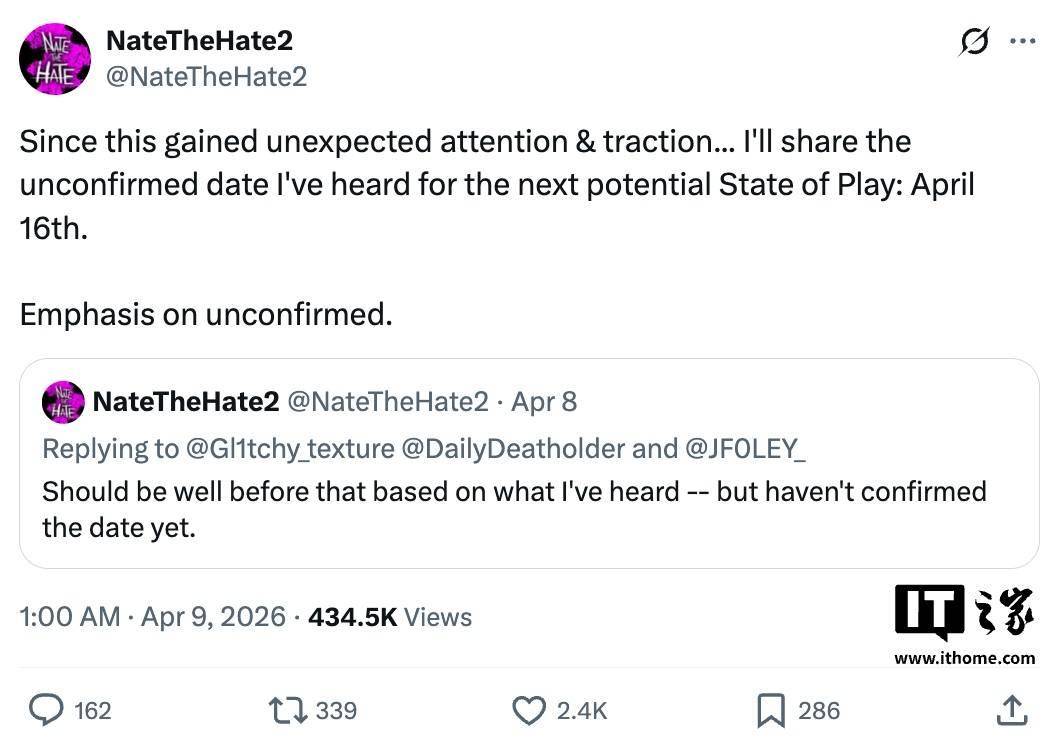 IT之家 4 月 9 日消息,消息源 NateTheHate 透露,索尼将于 4 月 16 日举行 State Of Play 游戏发布会,不过本次发布会中不会出现 PS5 第一方独占游戏。