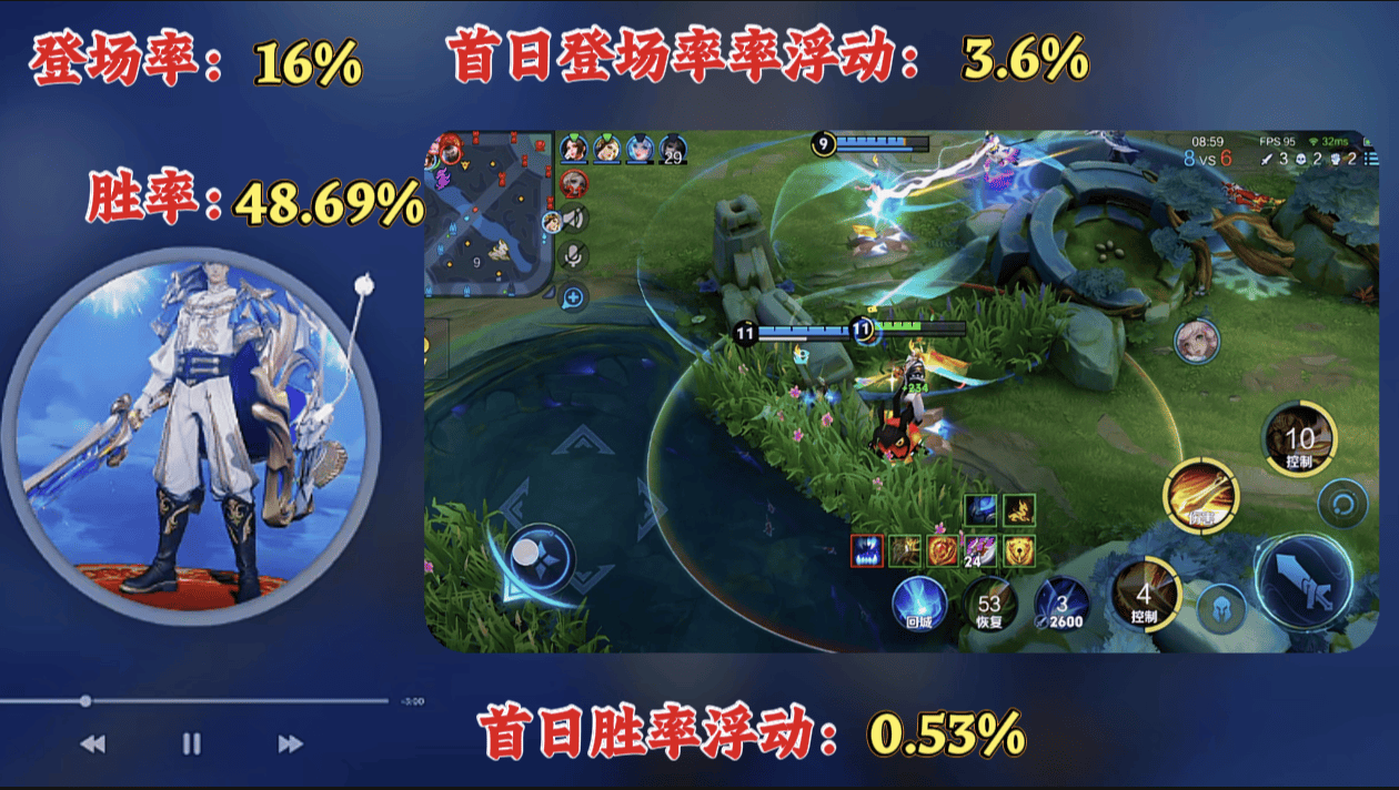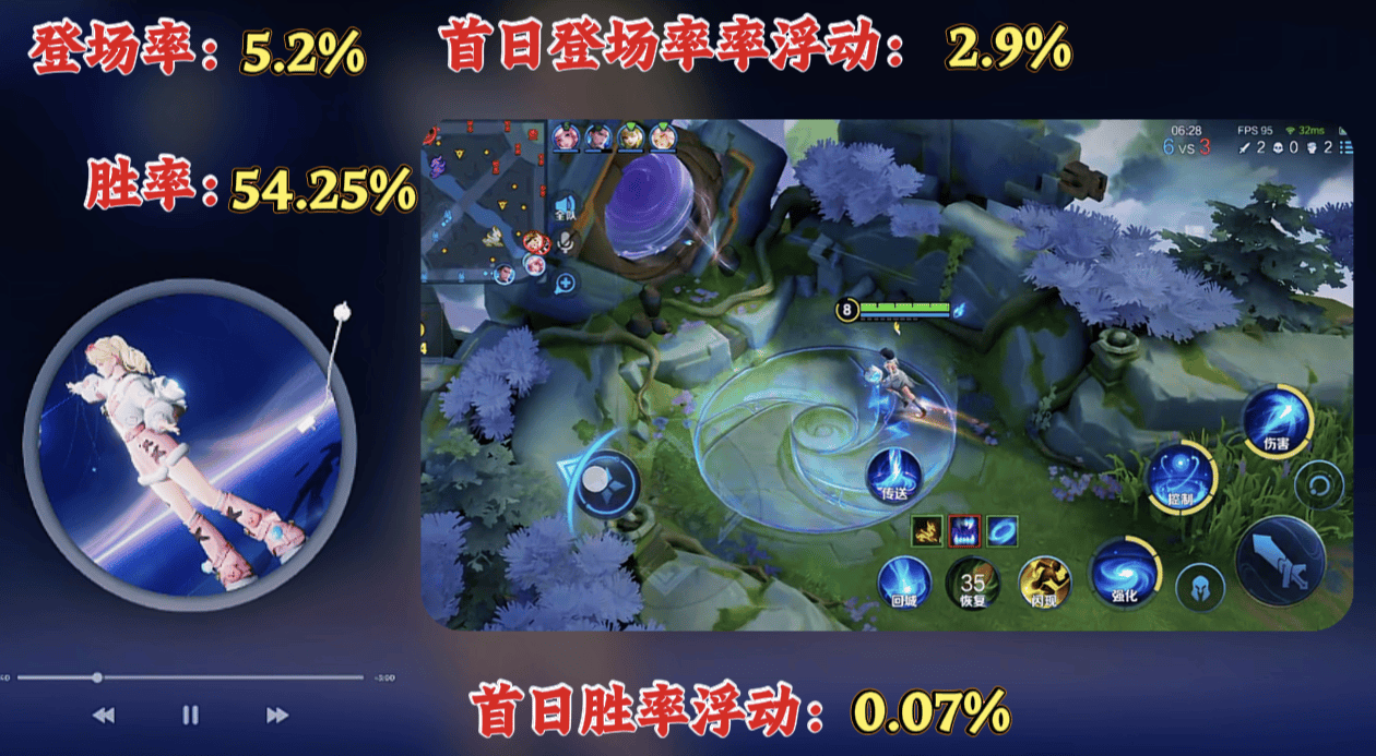 那么登场率翻倍的情况下,他的胜率却仅下滑了0.07%,可以忽略不计,当前胜率为54.25%
