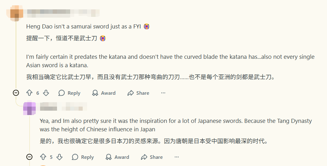 不少海外玩家自发查询了资料之后,在Reddit、YouTube等平台上自发科普:日本武士刀的早期形态(太刀)就源自中国唐朝的仪刀和横刀,两者在锻造工艺上存在传承关系,katana的锻造技术是日本的遣唐使从中国带回去的。