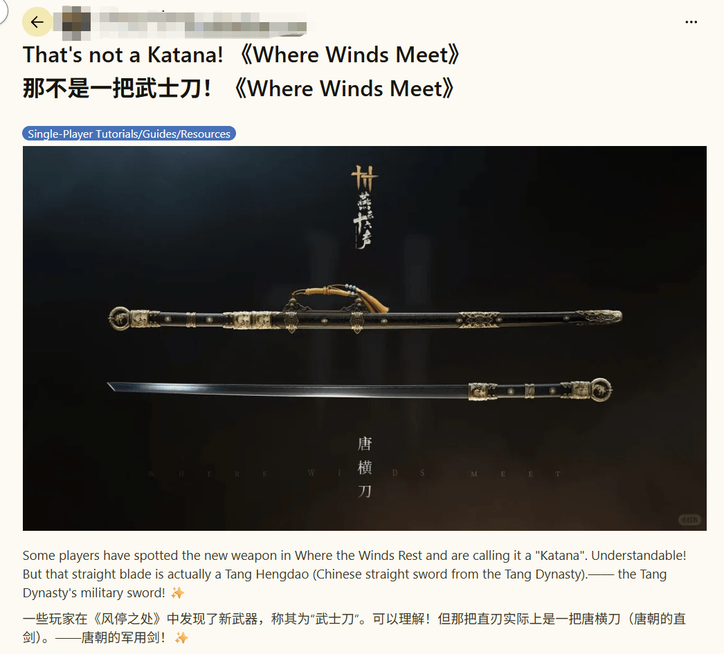 如今,《燕云》正在改变这点。像这次唐横刀上线,最初很多老外玩家以为,这把武器跟日本武士刀没什么差别,还有不少玩家直接就管他叫「katana」或者「samurai sword」。