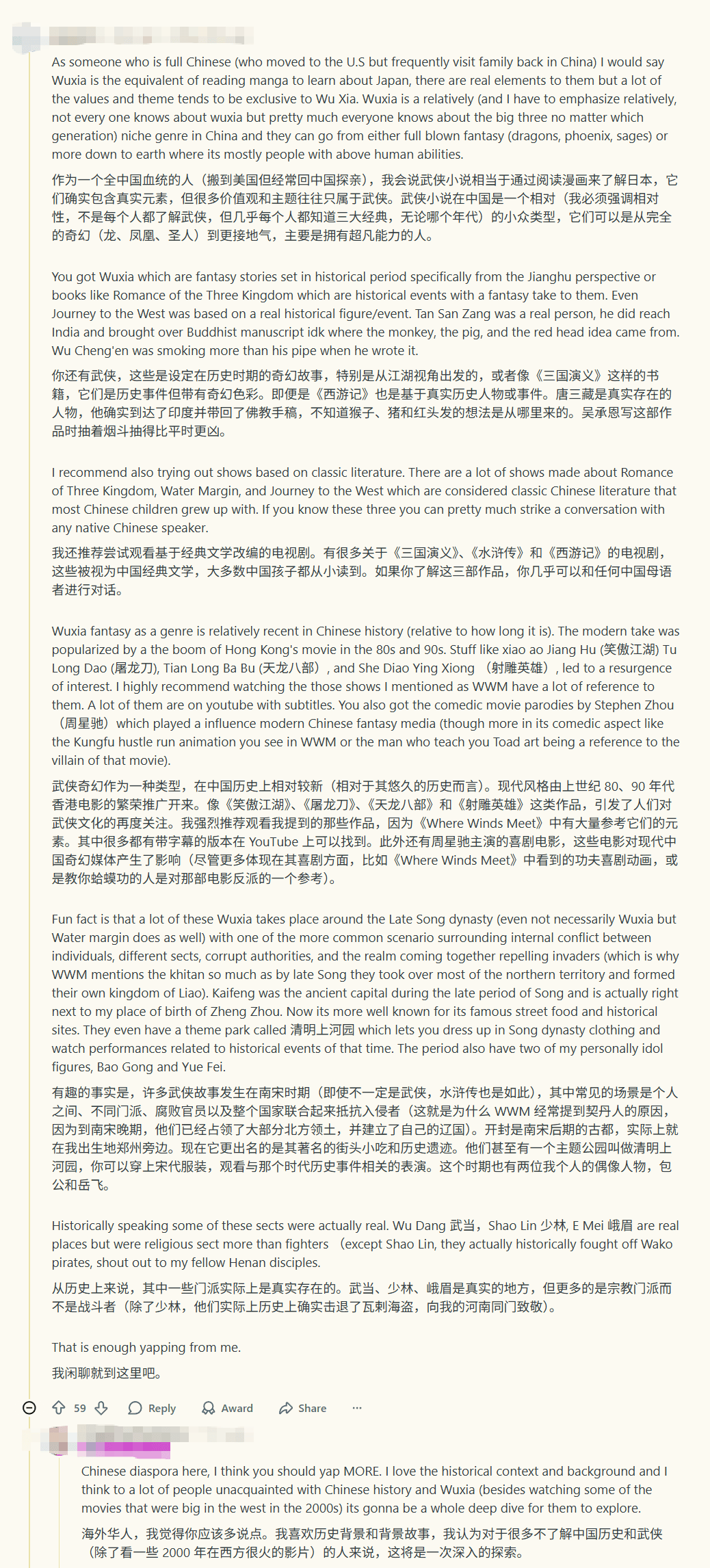 在社区里,中国玩家也自愿担当起了中国文化的讲解员,把《燕云》里的各种中华元素翻译给国外玩家,帮助他们好好感受这个游戏,让他们更了解中国文化。从一定程度上讲,这种行为本身就是一种武侠精神。