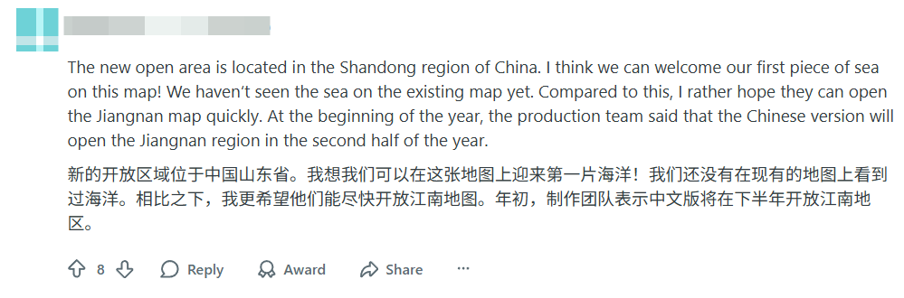 你以为这就完了?不不不。虽然《燕云》外服已经在尽力追赶国服进度,但海外玩家压根不满足于现有内容,他们胃口大着呢:最近《燕云》国服官宣4月24日更新全新区域「青州」,表示届时将推出新门派、新武器等内容,不仅引发国内玩家热议,连老外都「吃着碗里,望着锅里」,开始提前扒山东地图了……