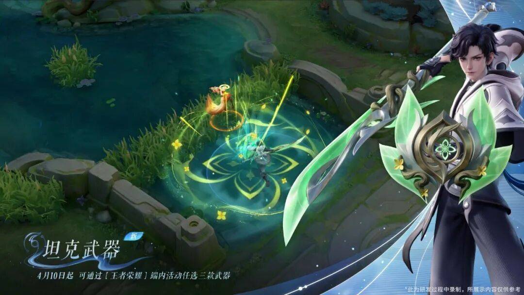 坦克武器名为“云梦止戈”,是刀与盾的组合,盾还可以变化大小。特效同样也是绿色为主。