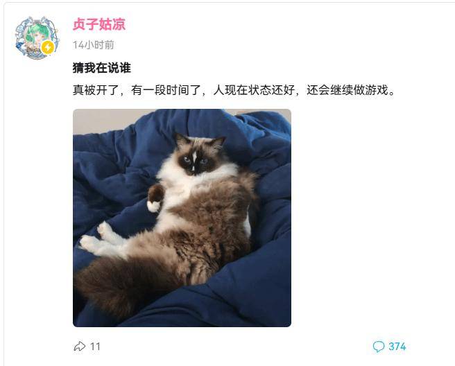B站 UP 主“贞子姑凉”昨日发文:真被开了,有一段时间了,人现在状态还好,还会继续做游戏。