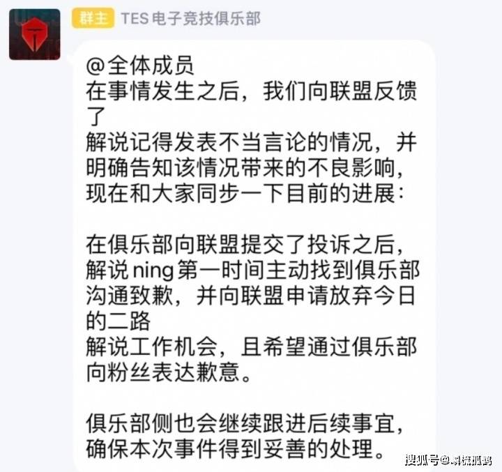 不仅如此,有网友也在赛后晒出了TES此前官方群的消息,显然遭到举报的不仅仅是这一件事,还有此前二路流的解说们。