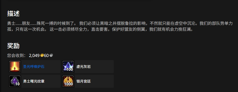 “圣光呼唤炉石”是任务“进军奎尔丹纳斯”的奖励,“光与影之战”系列任务的倒数第二步,完成大桥激战的场景战役后接取。该任务可在任意难度下完成,包括故事模式,后者难度极低,主要帮助休闲玩家走剧情。