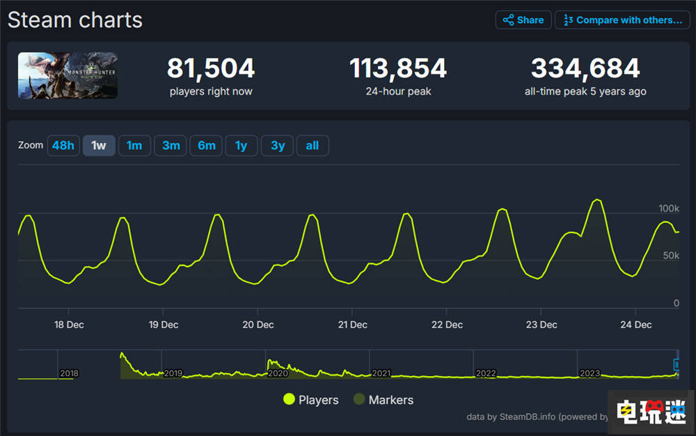 根据SteamDB的统计,《怪物猎人:世界》在近一周的时间里在线玩家数量直逼10万,而在周末就已经突破10万峰值。《怪物猎人》官方社交账号也再次发布消息感谢玩家。