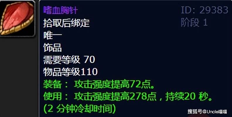 在TBC版本初期,当龙脊奖章还只是少数人的奢侈品,狂暴者的召唤尚未开放时,嗜血胸针就是物理玩家的“救命稻草”。这件只需少量公正徽章就能兑换的饰品,常驻72点攻强,使用后可获得278点攻强加成,持续20秒,冷却时间2分钟。