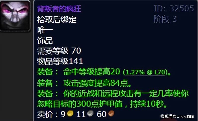 如果说龙脊奖章是急速流的代表,那么背叛者的疯狂就是破甲流的终极追求。这件出自黑暗神殿伊利达雷议会的饰品,不仅常驻84点攻强和20点命中等级,还能让近战和远程攻击有一定几率忽略目标300点护甲值,持续10秒。在TBC版本,命中属性极为珍贵,而破甲效果更是能让物理职业在面对高护甲BOSS时,打出前所未有的伤害。尤其是在太阳井高地版本,破甲流数值上来后再搭配龙脊奖章,能让输出能力再上一个台阶。