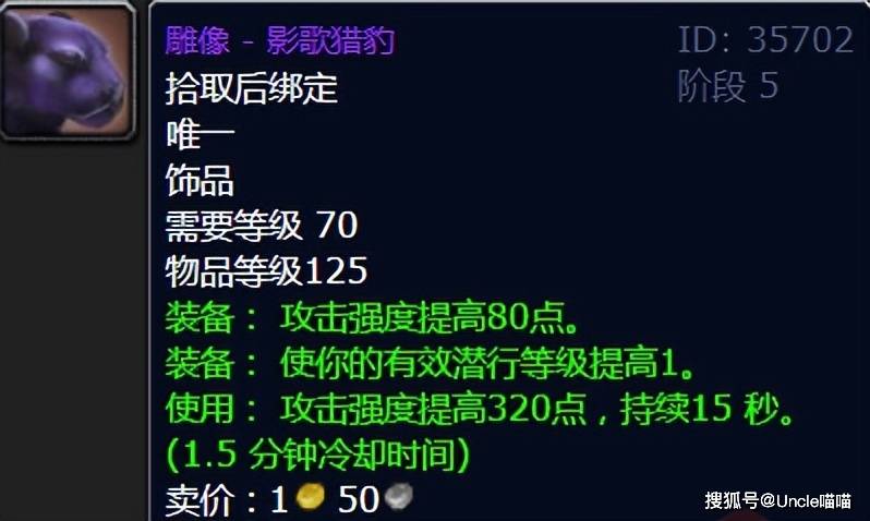 雕像影歌猎豹是TBC版本中由专业技能制造的顶级饰品,需要珠宝加工达到375级且破碎残阳声望崇敬才能学习图纸。这件饰品常驻80点攻强,还能使有效潜行等级提高1级,使用后可获得320点攻强加成,持续15秒,冷却时间仅为1.5分钟。
