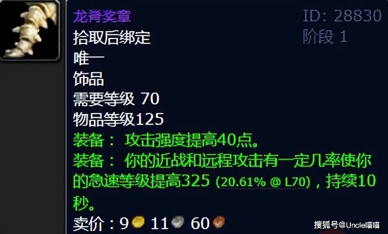 在TBC版本的物理系饰品中,龙脊奖章绝对是“信仰”一般的恐怖如斯存在。这件出自格鲁尔巢穴的饰品,虽然常驻属性仅为40点攻强,看似不起眼,但其触发特效却堪称恐怖——近战和远程攻击有一定几率使急速等级提高325点,持续10秒。覆盖率可观,能让物理职业的攻击速度全程保持在一个较高的水平。