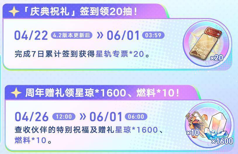 除了纪念册以外,这次三周年的其他福利也是极为丰盛。签到赠送20张星轨专票和1600星琼,总计30连抽: