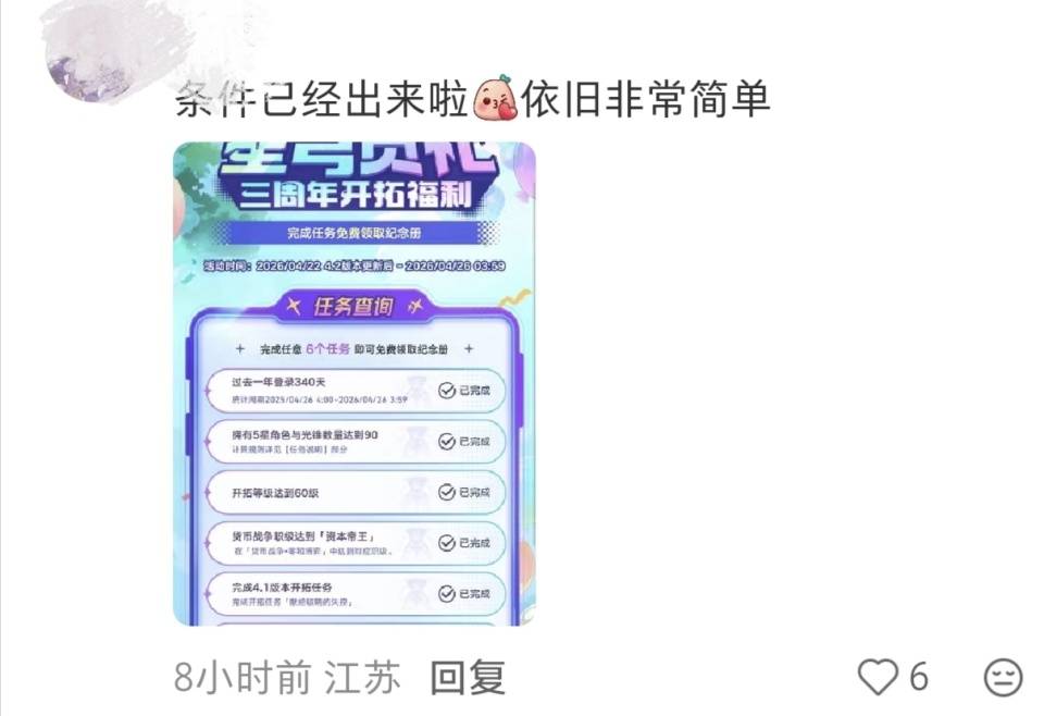 对于崩铁玩家来说,达到获取纪念册的条件并不算困难,看得出官方为了玩家能顺利拿到纪念册也是很贴心了。