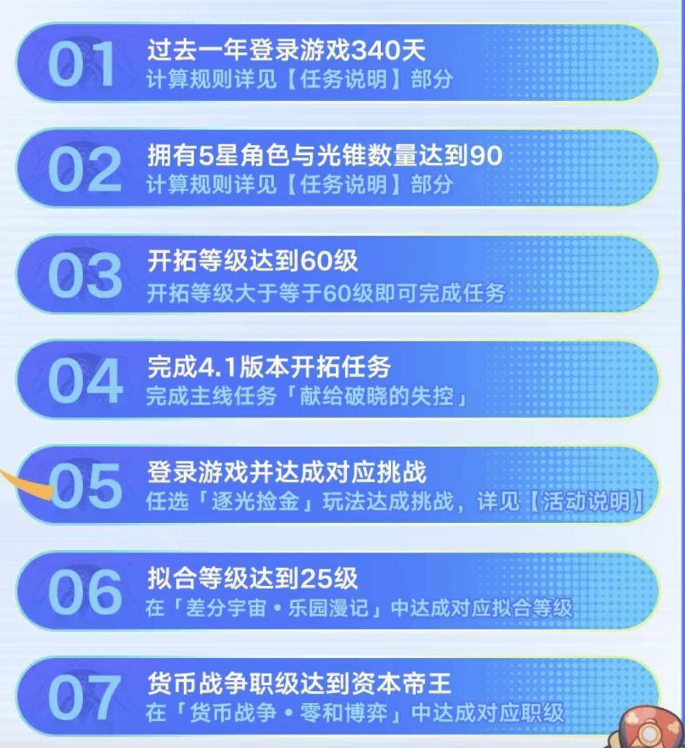 目前官方也公布了免费领取纪念册的任务,包含过去一年登陆340天、拥有90个五星角色和光锥、开拓等级到达60级等条件。