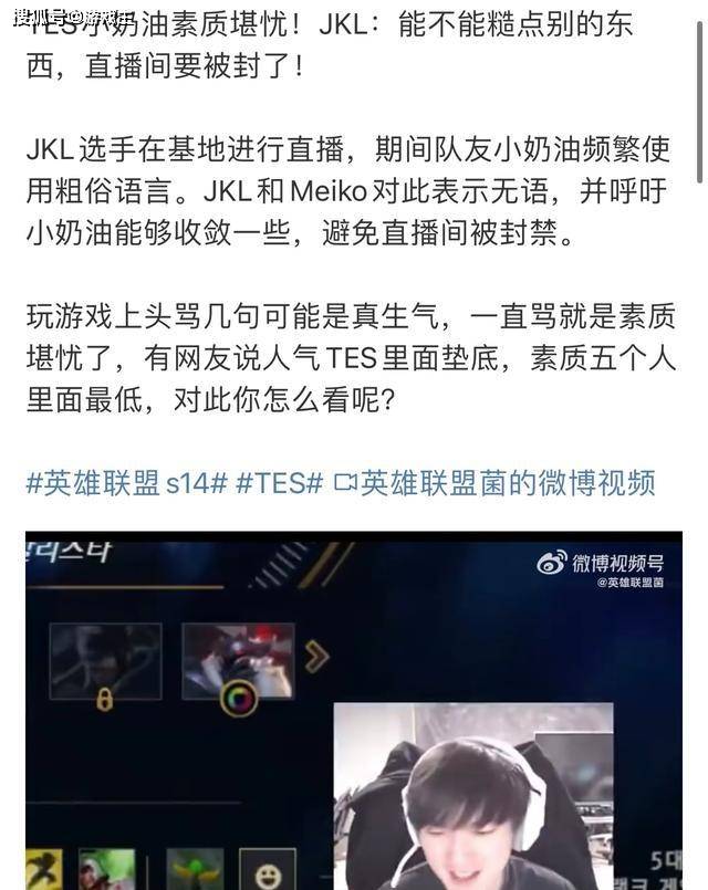 369,小奶油和meiko的加入,直接让tes战队跻身到了超一流的行列当中。很多的粉丝们都在期待着全新的tes战队的状态,在最近的直播过程当中,tes战队的选手们配合还是比较默契的,但是也出现了一个非常尴尬的问题,小奶油作为整个战队资历比较小的选手,目前的素质真的是有待提升,从AD选手阿水的直播间中就能够听到小奶油的脏话,而且是接二连三不间断的,甚至在队友不断提醒之后,他也没有任何的调整,这一点对于职业选手来说是很不友好的。