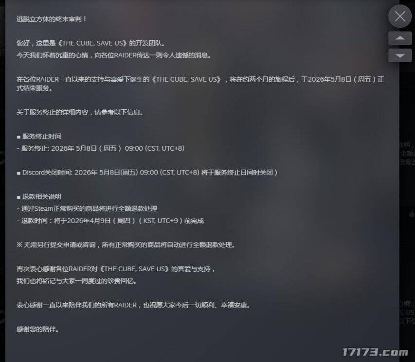 由韩国XLGAMES运营,旗下Studio Cube工作室研发的搜打撤游戏《立方救赎(THE CUBE, SAVE US)》宣布,游戏将于5月8日停运,Steam上购买商品的可全额退款。
