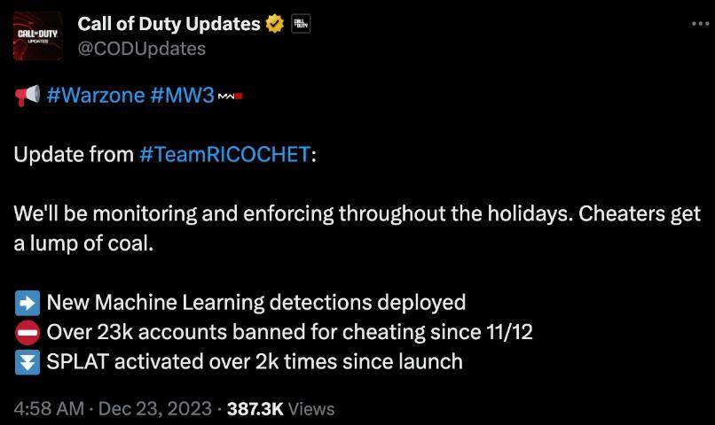 自从不良玩家作弊导致大量玩家吐槽游戏体验且被官方重视后,动视的“Team RICOCHET”在不断努力完善其《使命召唤》的反作弊算法和机制,不断侦测与打击进入《使命召唤》联机对战的作弊者数量。据最近的媒体消息透露,一个月内就有超过2万3000个账号因作弊而被封禁。