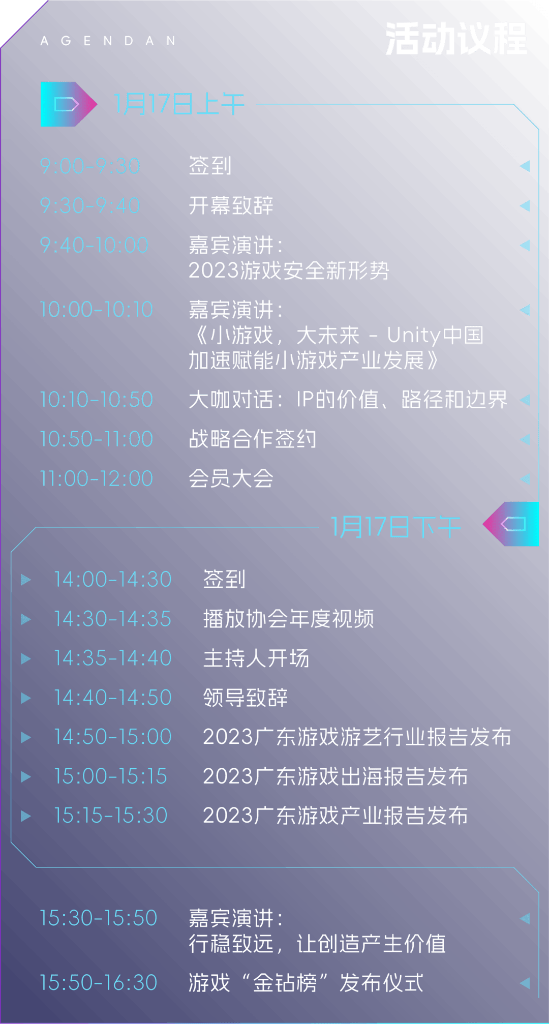 “2023广东游戏产业年会暨‘金钻榜’发布仪式”将于2024年1月17日在广州市海珠区盛大召开。本届大会以“逐光聚能,蓄势奋发”为主题,聚焦游戏产业的未来发展方向,继续加强技术创新、跨界融合、国际合作等方面的探索和实践,推动游戏产业向更高质量、更宽领域、更具国际化水平方向发展。作为业内极具知名度和影响力的游戏行业盛会,届时现场将亮点纷呈,敬请期待!