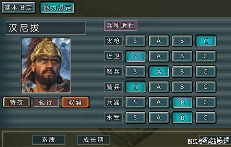 世人皆知汉尼拔玩得最好的兵种是重甲步兵和象兵,这就是他在三国志11国际版同时具备S级的近卫和骑兵的根本原因。遗憾的是,这两个兵种在后期的科技提升空间有限,而关键的坦克等级却只有B级,所以汉尼拔只能处于四大统帅里的垫底位置。