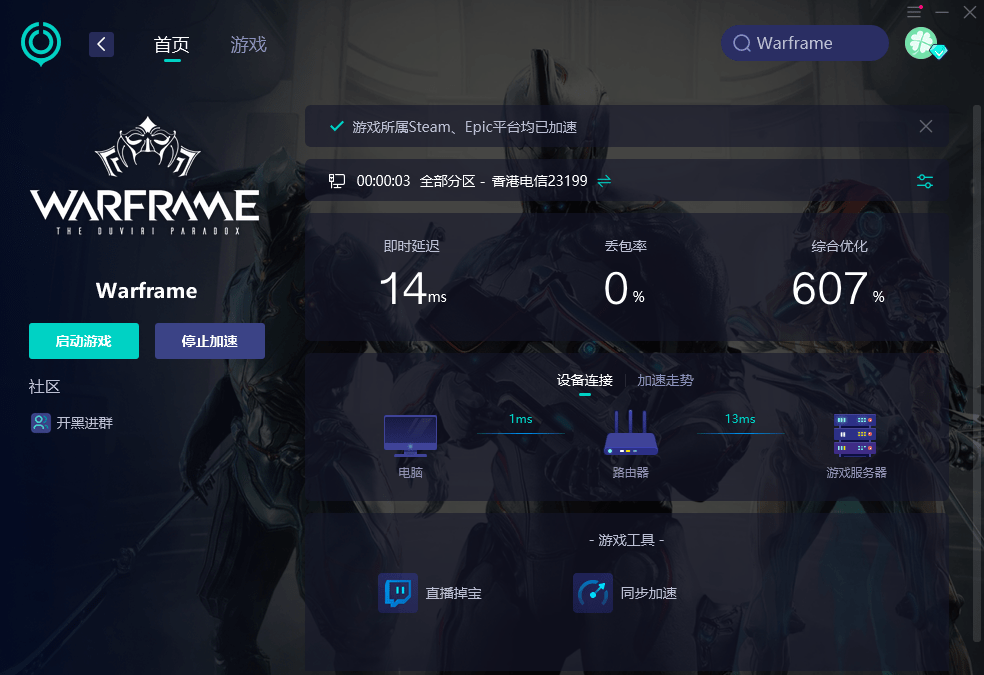 (步骤2)点击后获得稳定网络连接,畅玩《Warframe星际战甲》