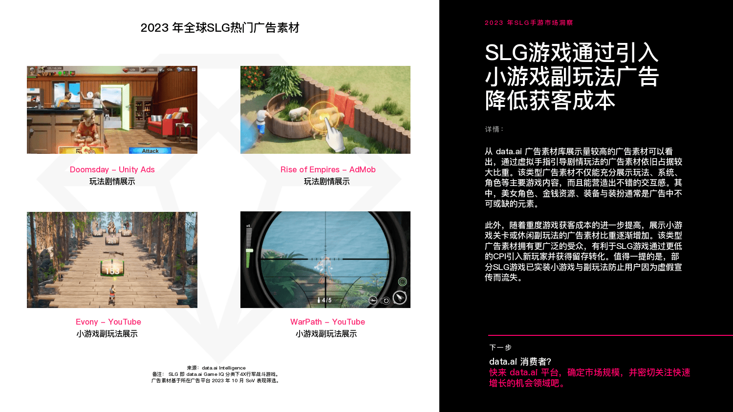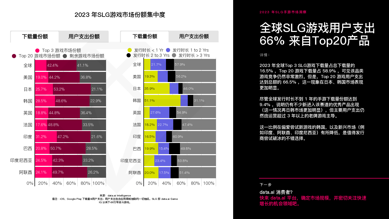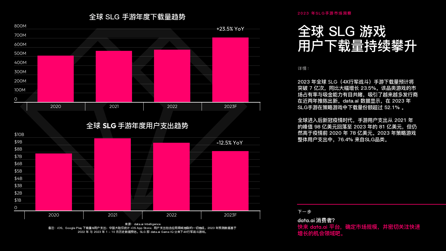 2023 年全球 SLG (4X行军战斗) 手游下载量预计将突破 7 亿次,同比大幅增长 23.5%。该品类游戏的市场占有率与吸金能力有目共睹,吸引了越来越多发行商在近两年推陈出新。data.ai 数据显示,在 2023 年SLG手游在策略游戏中下载量份额超过 52.1%。拥有超高投资回报率的SLG赛道,一直是中国内地厂商掘金全球的一大利器。近年来,海外市场上虽也出现了不少优质国产SLG的身影,但还尚未出现强势破圈的爆款,这两年大环境期间也被大量涌现的轻度产品抢走不少风头。