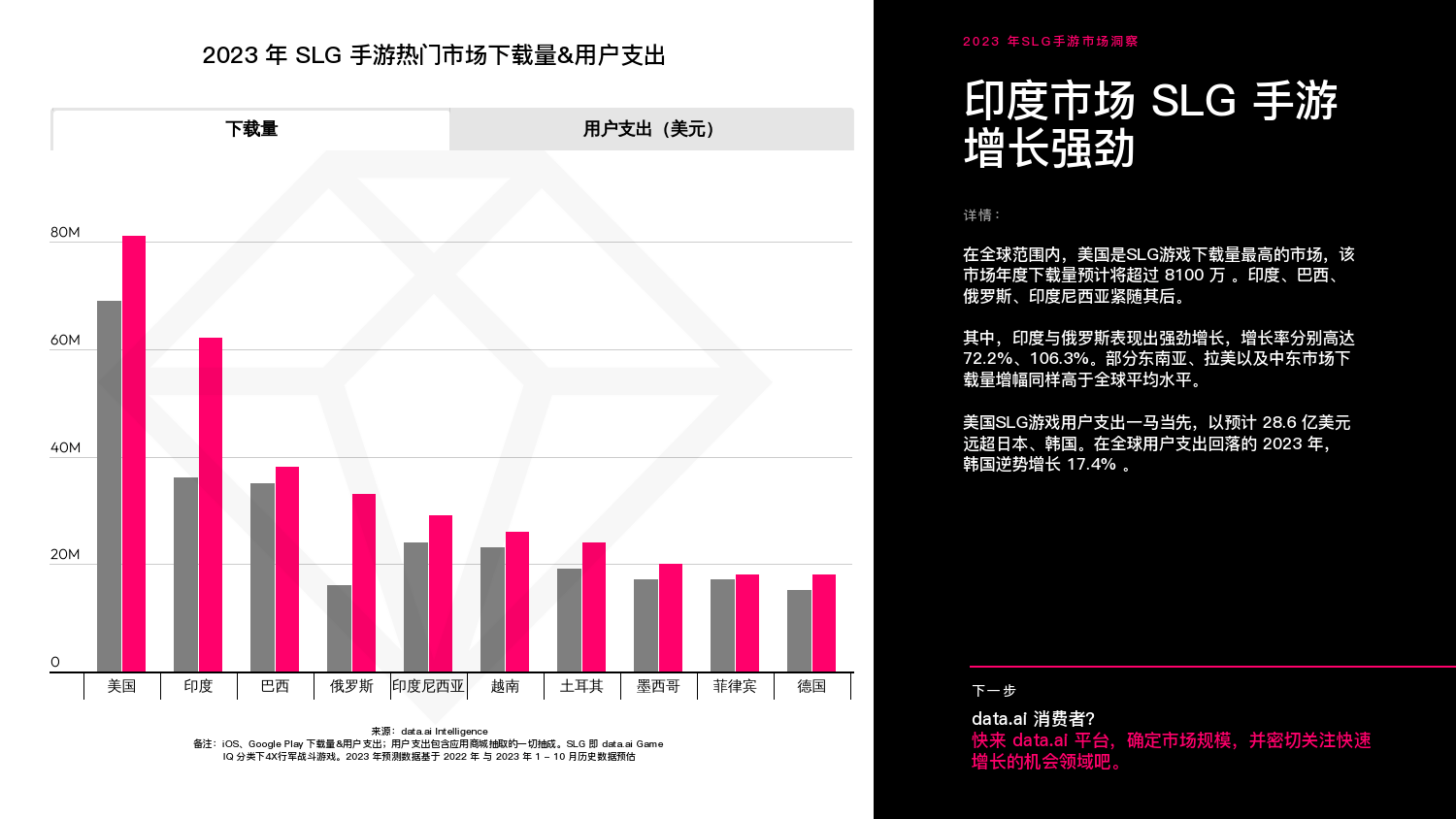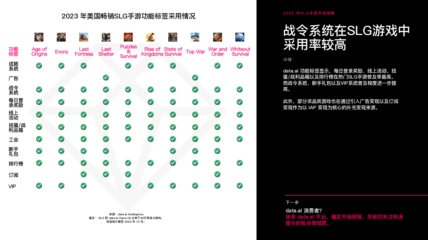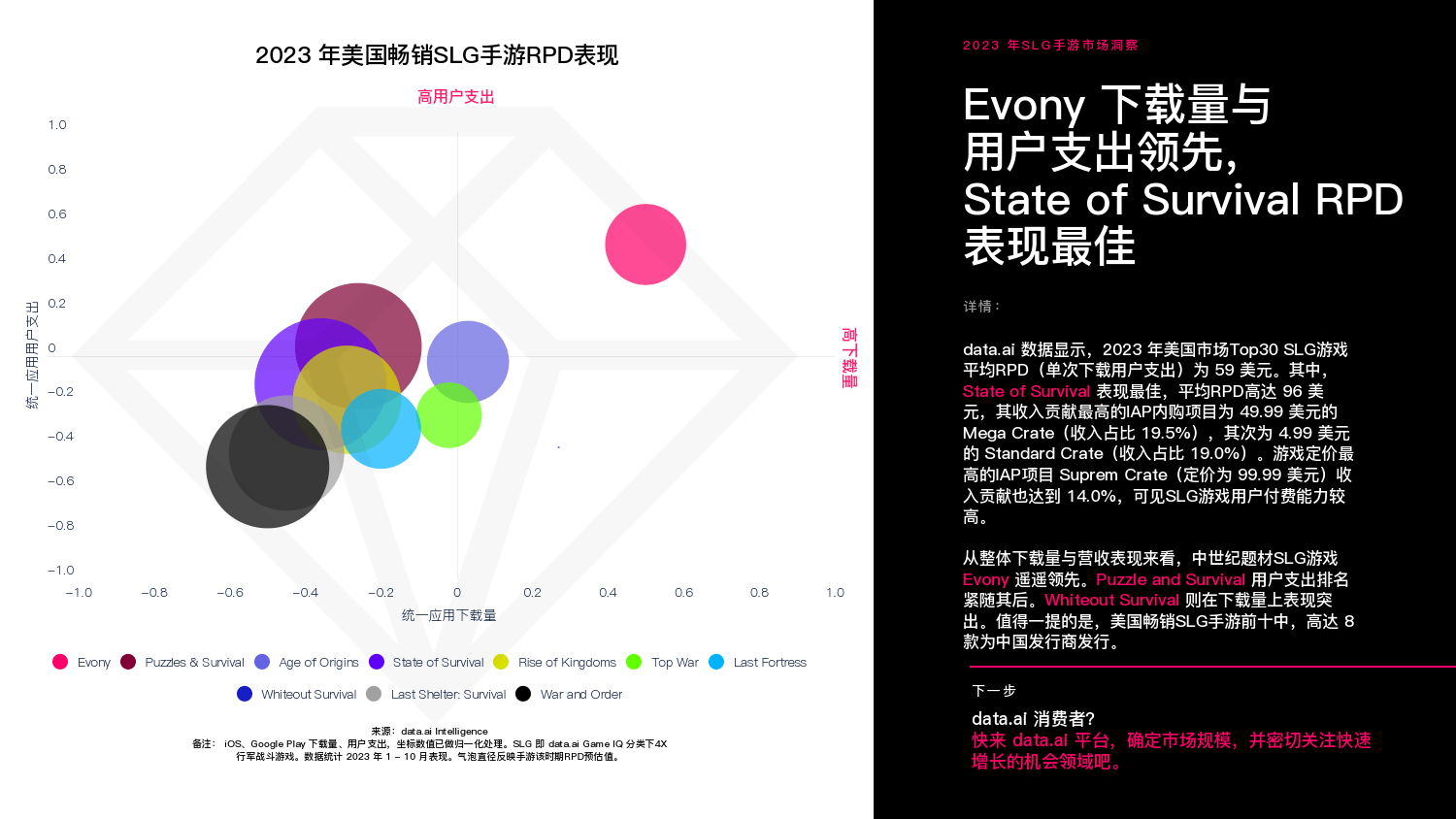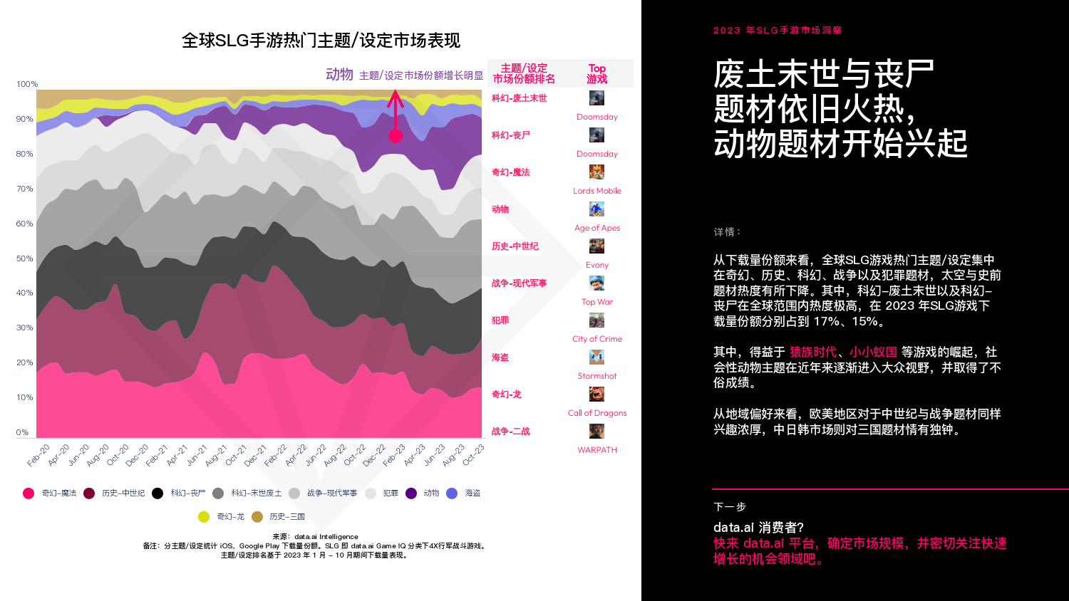 2023 年全球 SLG (4X行军战斗) 手游下载量预计将突破 7 亿次,同比大幅增长 23.5%。该品类游戏的市场占有率与吸金能力有目共睹,吸引了越来越多发行商在近两年推陈出新。data.ai 数据显示,在 2023 年SLG手游在策略游戏中下载量份额超过 52.1%。拥有超高投资回报率的SLG赛道,一直是中国内地厂商掘金全球的一大利器。近年来,海外市场上虽也出现了不少优质国产SLG的身影,但还尚未出现强势破圈的爆款,这两年大环境期间也被大量涌现的轻度产品抢走不少风头。