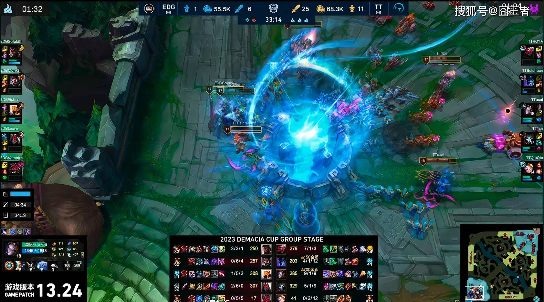 而原TES的辅助球球,他的一手绝活机器人,更是勾得EDG全队畏手畏脚的,特别是EDG新AD,一直处于机器人钩子的威胁下,一直发育不起来。TT中单UCAL的发条,更是神出鬼没,让EDG残血众将惶惶不可终日,躲在草丛中都会被发条找到,一套送走。最终TT在33分17秒的时间内,不算太难的轻取EDG,拿下宝贵的一分。