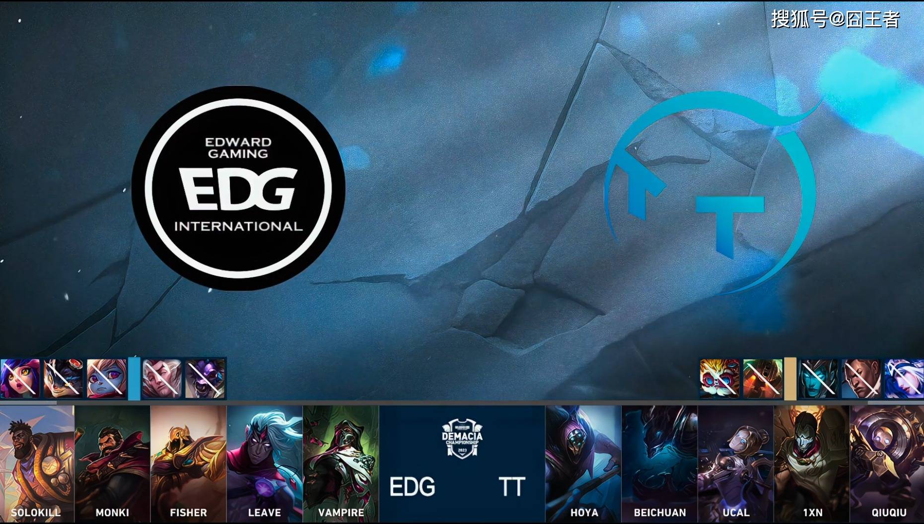 EDG蓝色方,禁用妮蔻、兰博、波比、洛、牛头,选用奎桑提、泰坦、沙皇、韦鲁斯、烈娜塔;TT红色方,禁用艾希、卢锡安、卡莉斯塔、泰坦、大头,选用武器、梦魇、发条、烬、机器人。