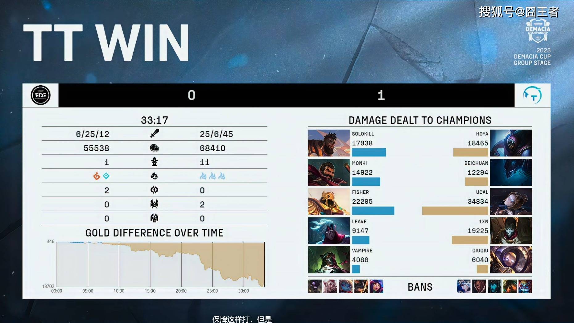 结果第一局比赛,EDG除了在前10分钟能和TT打得有来有回之外,其他时间全程被TT全维度压制。特别是上单Hoya,他的贾克斯真就是天上降魔主,却是人间太岁神,吊打EDG全队,甚至在后期他在拿到三杀后,还站在EDG高地门口跳舞。
