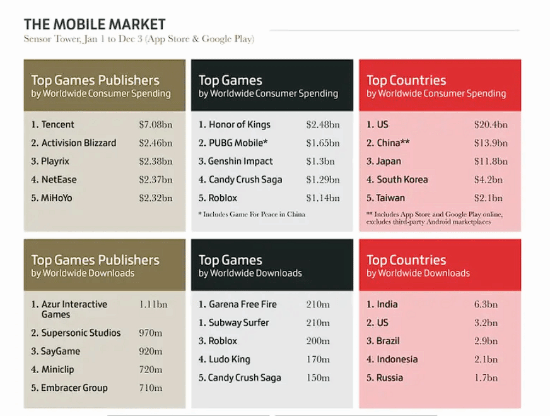 而在手游市场,收入最高的游戏发行商是腾讯,用户消费最高的是《王者荣耀》,但消费金额最高的是美国。