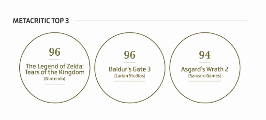 M站提供的数据显示,今年平均分数最高的三款游戏分别是《塞尔达传说:王国之泪》、《博德之门3》和最近推出的VR游戏《阿斯加德之怒2》。其中《塞尔达传说:王国之泪》和《博德之门3》并列第一,均获得96分综合评价的好评。