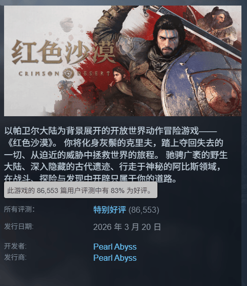 在发售前后的48小时内,《红色沙漠》故事几乎就已经被写好了:3月18日,游戏上市前的宣发预热达到顶点时,媒体评分解禁:77分。第二天游戏上线Steam,评价只得“褒贬不一”,开发商Pearl Abyss的股价一度大跌30%。