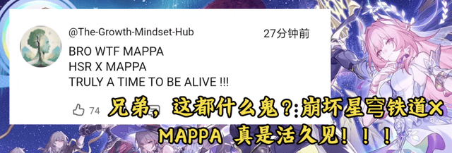 这个消息可以说直接引爆了外网社区,相关讨论层出不穷,让Mappa这个词条登上了日推趋势榜的第四。有玩家称这次合作真是活久见,很多人在震惊之余也被PV画面惊艳到,表达了对崩铁原创动画的期待。