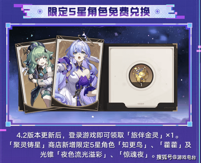 说到角色,崩铁在4.2版本还有一个重磅福利,就是藿藿和知更鸟及其光锥加入「聚灵铸星」商店,同时给每位玩家发放1个“旅伴金灵”,用于兑换商店中的限定五星,相当于直接给玩家赠送一个限定五星了。