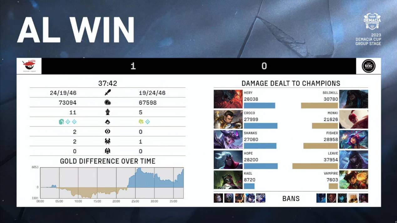 而最后一场对阵小组赛实力偏弱的AL的比赛中,EDG一度在获得优势的情况下连续失误,被对手击败,最终战绩定格在0-3,本场比赛EDG也是各种幽默操作不断,前期打出8-2开局的情况下,下路Leave强行压制塔下两人被一套控制链带走。