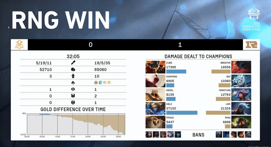 上单碾压,打野碾压,中单碾压,下路独木难支,OMG被RNG很轻松完成了碾压局。选择EZ巴德这种组合,前期上中野还烂掉了的情况下,以EZ的小水枪持续输出能力来看,这就是死局了。Ming回归之后,至少在德杯的首秀局,还是展现出了有团队大脑的强势。基本上没有给OMG太多机会,甚至最后是稳到令人发指的三龙Buff齐全,一波流直接结束了比赛。