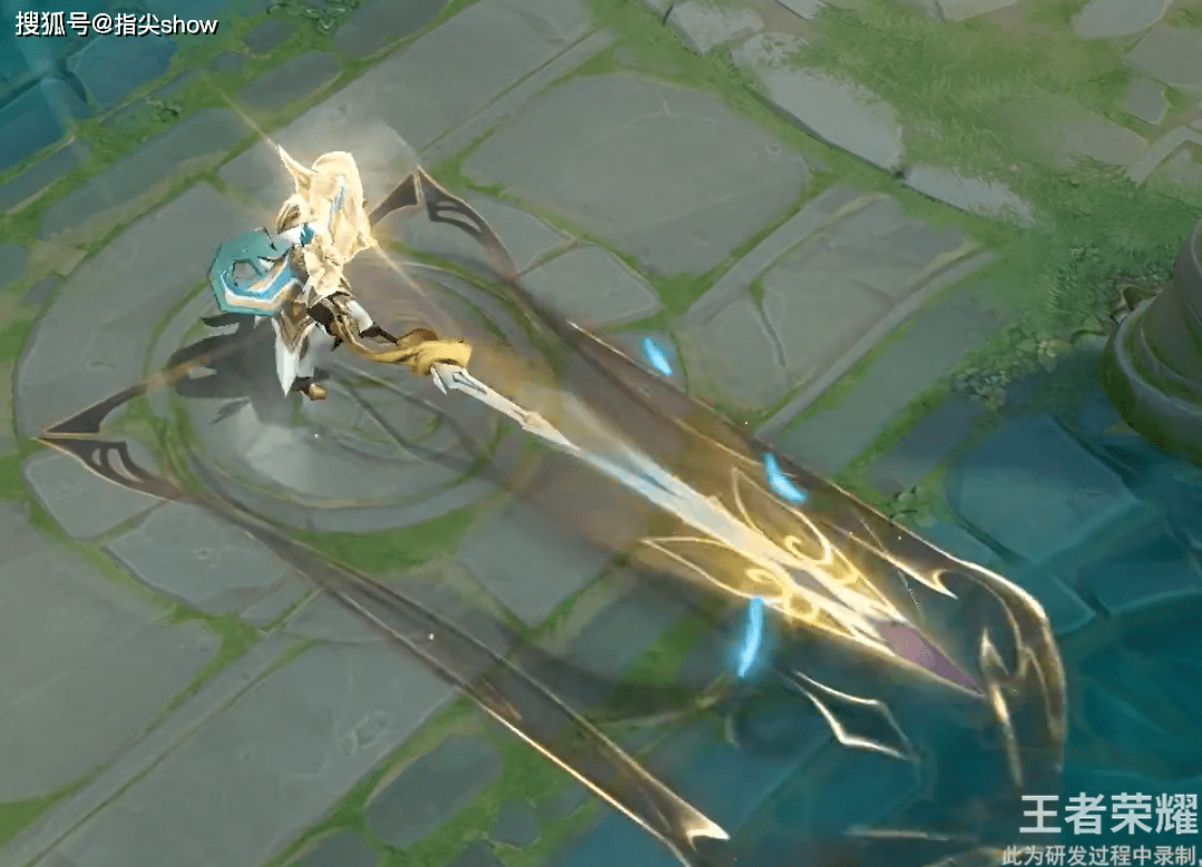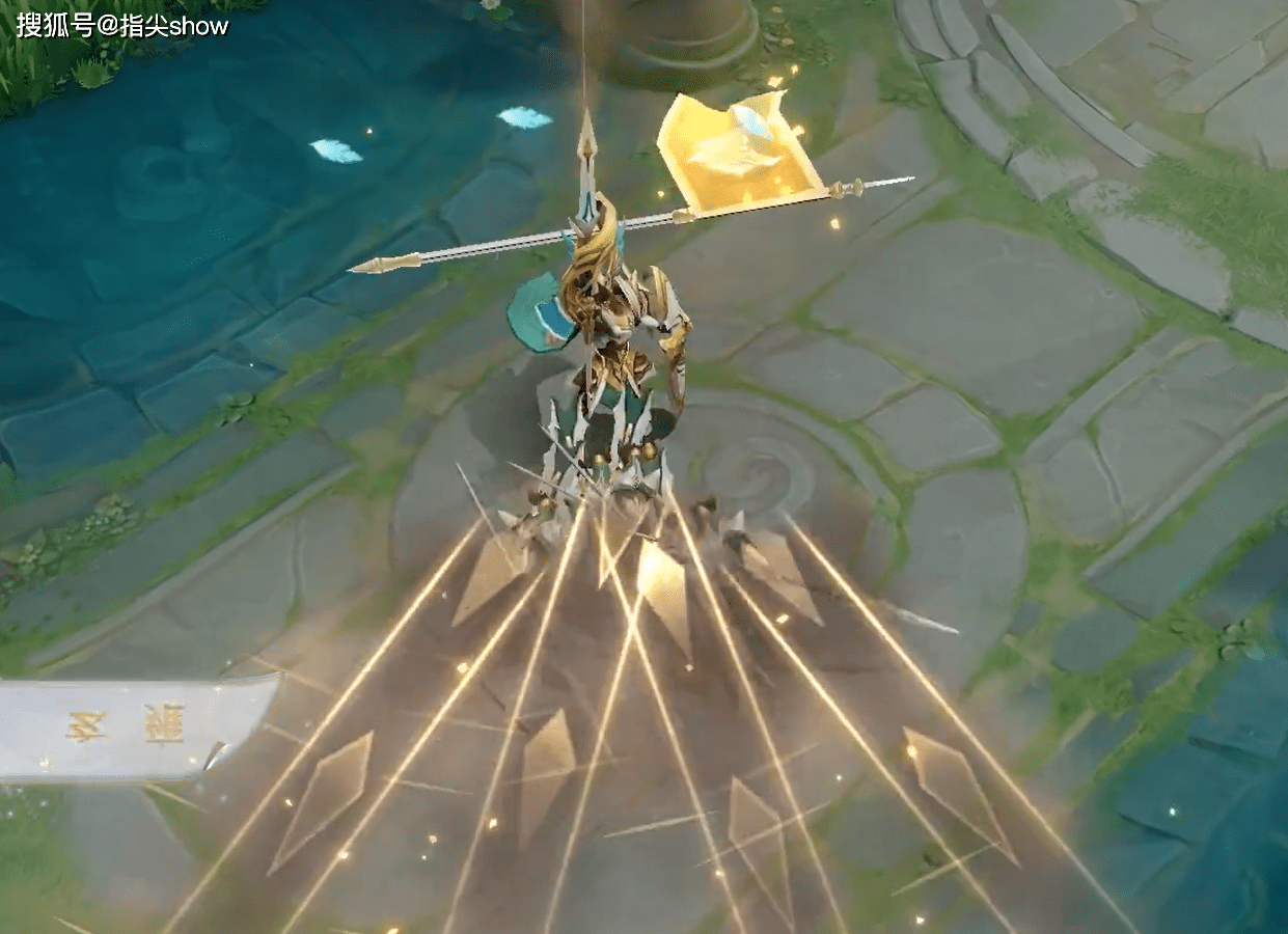 一技能白金色长矛向前推击出金色光翼,比较简单的一个特效,其实这个英雄能做出特效的也只有强普和大招了,12技能不要抱有太高的期待。