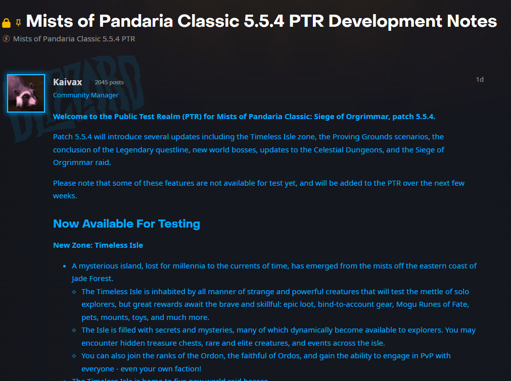 暴雪在《魔兽世界》熊猫人怀旧国际服的PTR上发布了5.5.4版本,也就是P5更新,开启永恒岛和传说任务线的终章,决战奥格瑞玛团本的测试将于4月24日开始,天界地下城、挑战模式和试炼场的测试将在稍后进行。