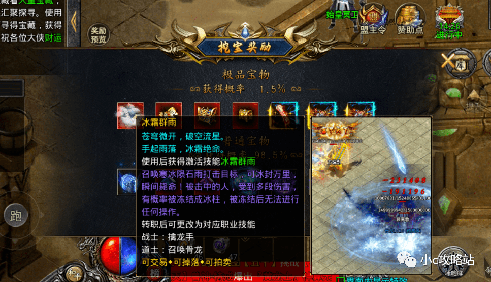 游戏中召唤骨龙、冰霜群雨、擒龙手都属于对应职业的高级技能,只能通过周三限时活动寻宝获得。