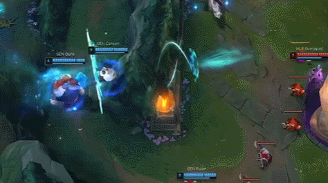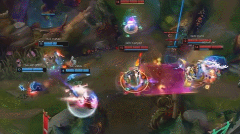 随后GEN甚至拿下龙魂,本以为局势好起来了,结果很快HLE就在F6野区打出精彩团战配合再次掌握团战主动。