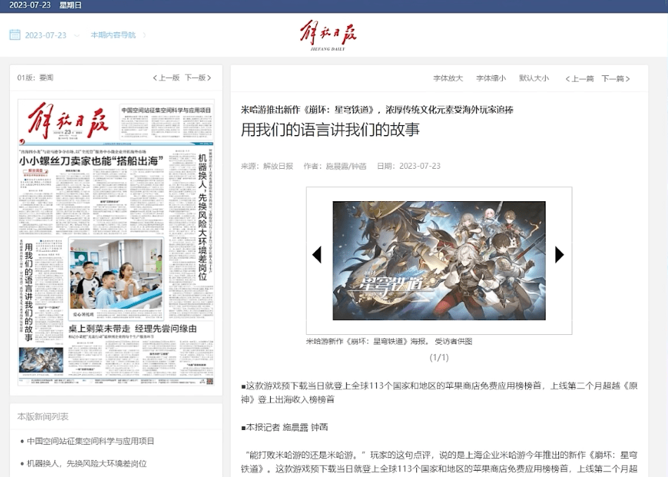 而且不单单是各类奖项拿到手软,星穹铁道的游戏内容还多次获得官媒称赞和认可。今年7月,星穹铁道发布的「水龙吟」EP,就登上了解放日报,这篇报道的标题是“用语言讲我们的故事”,文章中盛赞星穹铁道中浓厚的中国元素,称游戏是在培养热爱和理解中国文化的玩家,字里行间都能体现出对星穹铁道的认可。