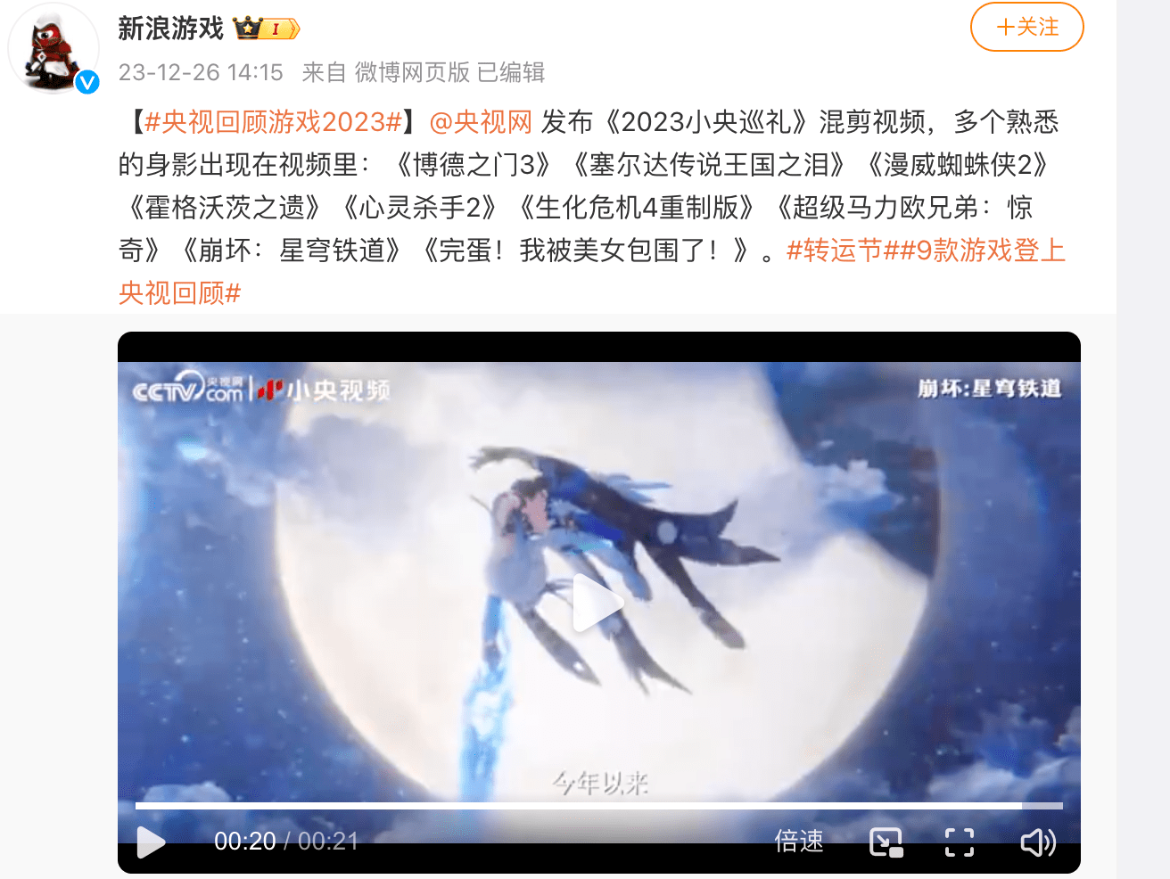 这么一看,星穹铁道能登上央视年度回顾,在短短的游戏回顾画面中占去几秒镜头,也是很正常的事了。再看其他上镜的游戏,也都是拿到TGA奖项的海外知名大作,能跟这些游戏同时登场,也证明了星穹铁道本身的质量是值得认可的。