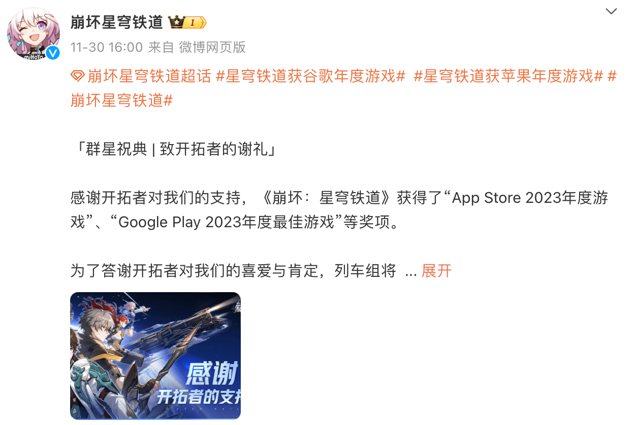 除了TGA奖项外,星穹铁道今年取得的成绩也证明游戏确实值得。在TGA奖项公布前,谷歌和苹果前后脚公布年度大奖,其中年度最佳游戏都给到了星穹铁道,谷歌还给了一个最佳剧情游戏的奖项,说星穹铁道是年度获奖最多的国产游戏都不为过。