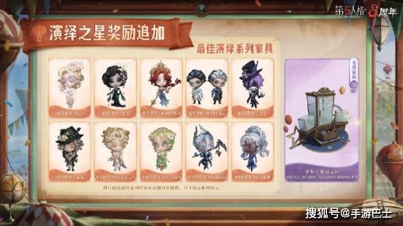 4月30日至5月4日,本年度的最佳演绎评选正式开启。在此期间,阅历≥15级的访客们可以将通过完成对战任务、解锁最佳演绎系列时装图鉴及预测正确的形式获得的宁芙卡赠送给往年被选为“演绎之星”的演员。获得宁芙卡数量排名第一和第二的求生者与监管者角色都将获得“最佳演绎”的荣誉加冕。